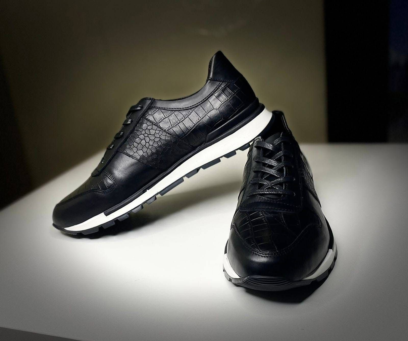 Chaussures décontractées en cuir noir, style baskets avec semelle blanche. Livraison rapide en Guinée Conakry.